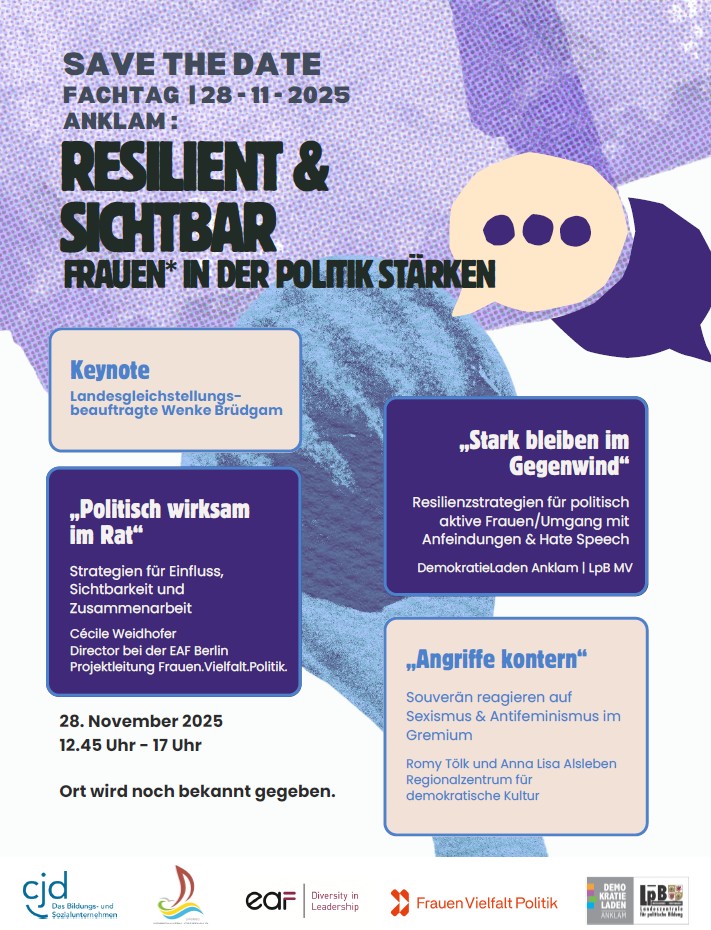 Die Veranstaltungsreihe wird gefördert durch das Bundesministerium fĂŒr Familie, Senioren, Frauen und Jugend. Die Teilnahme ist kostenfrei. Teilnehmen können alle Frauen, die sich ehrenamtlich politisch engagieren oder politisch interessiert sind. Infos und Anmeldung unter www.vhs-vg.de.