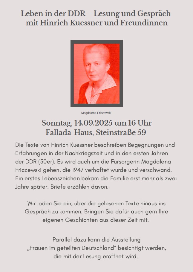 Zur Eröffnung der Reihe am 16. September laden wir ab 19 Uhr im Frieda 23-Studio zu Lesung und GesprĂ€ch mit der Kuratorin der Ausstellung "Frauen im geteilten Deutschland", Clara Marz, und Maren Wurster, Autorin und Mitherausgeberin des Buchs "Ost*West*frau*", das biografische Geschichten aus Ost und West versammelt. Alle weiteren Termine und Informationen finden Sie im Flyer.Â
